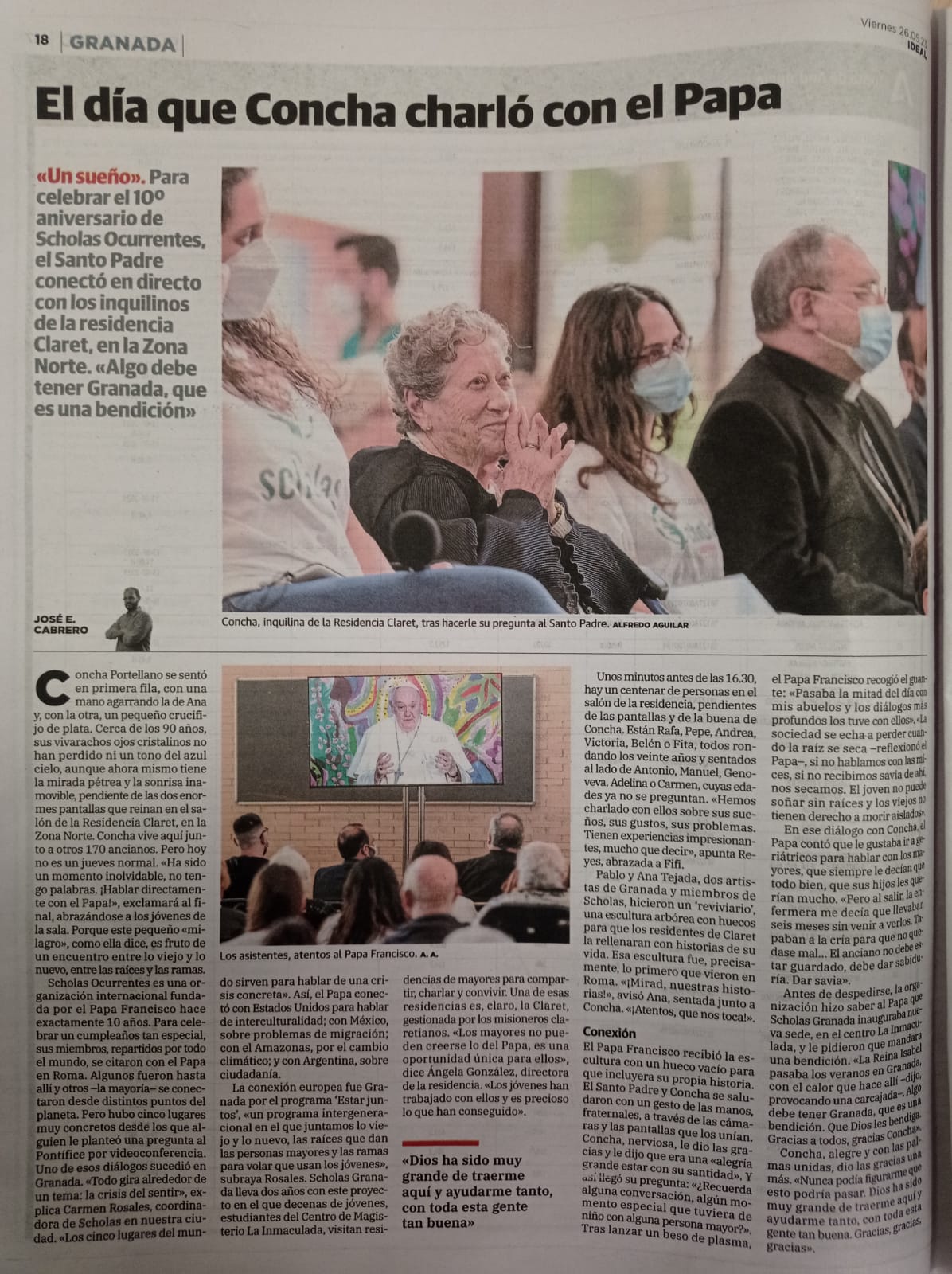 El pasado jueves 25 de mayo, en la Residencia Claret Granada tuvieron la fortuna de conectarse en directo y tener la oportunidad de charlar con el Papa Francisco, a través del proyecto «Estar Juntos», organizado por la Fundación Scholas, evento que fue transmitido internacionalmente gracias a Telemundo.