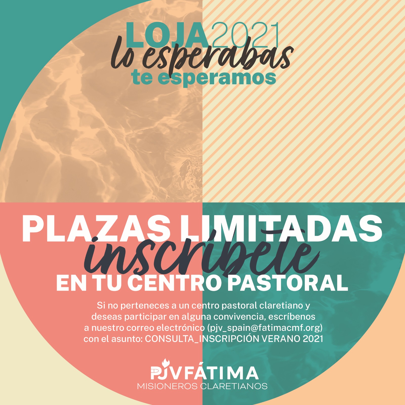 In the social networks of the Youth Pastoral Team of Spain you can find all the information (Twitter: @pjvfatima_sp; Facebook and Instagram: @pjvfatima.sp) of each of the encounters that are going to take place. In addition, those who do not belong to a Claretian pastoral centre and wish to participate in any of the retreats, can inform us by e-mail (pjv_spain@fatimacomf.org), indicating ‘CONSULTA_INSCRIPTION_SUMMER 2021’ in the subject line. Places are limited.