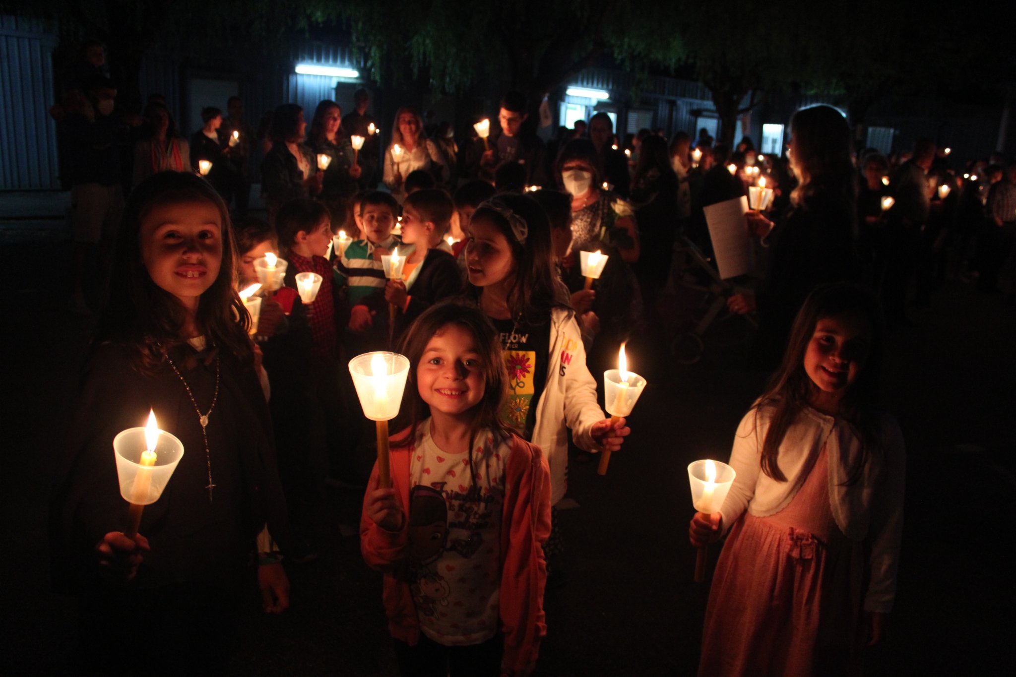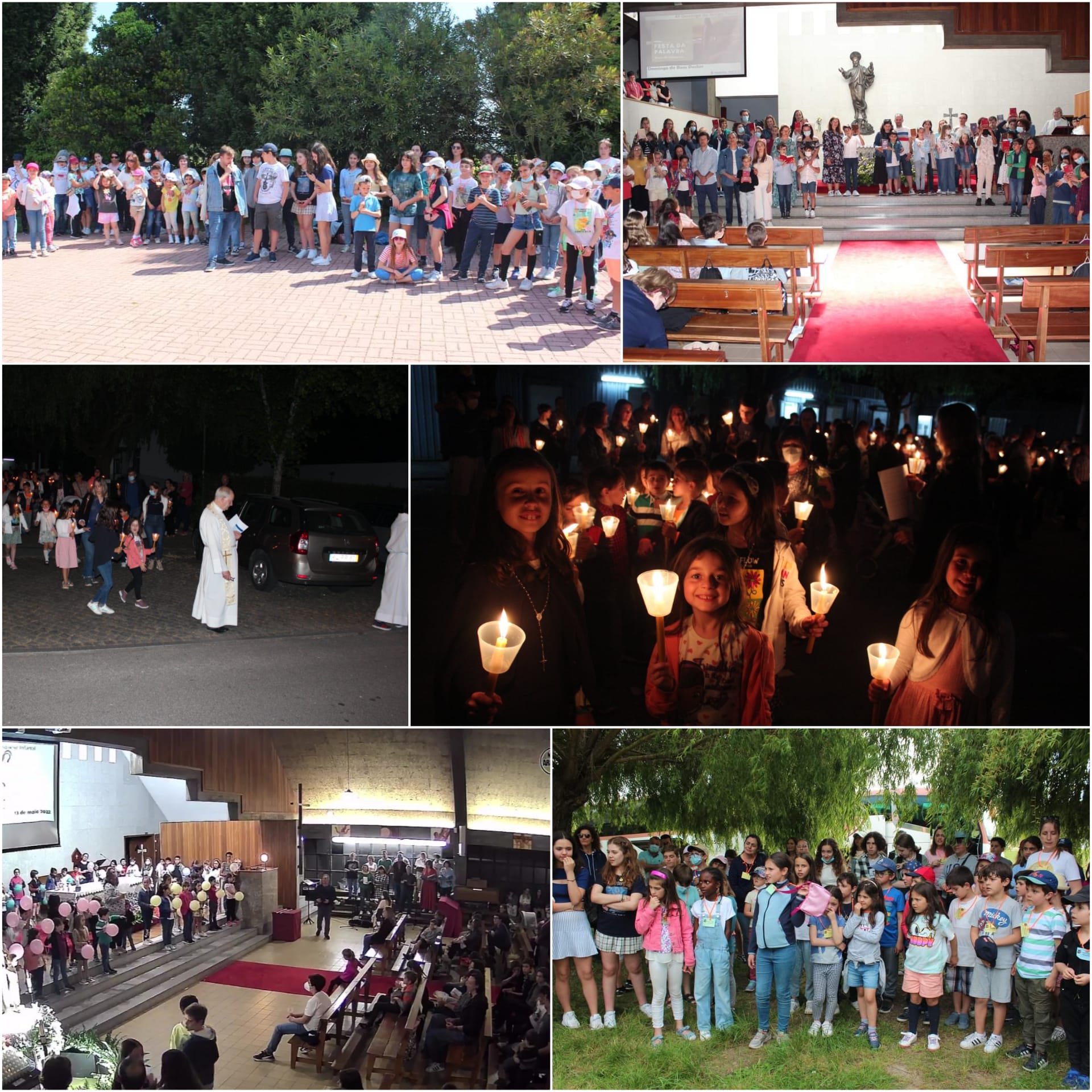 Procesión y rezo del Rosario (13 de mayo). Coincidiendo con la celebración del Día de Nuestra Señora de Fátima, la Catequesis propuso la organización de una Procesión de Velas, que fue aceptada por la Oficina Parroquial, el «Comité Permanente». Fue una forma de mostrar a la comunidad en torno a la iglesia que, a pesar de las restricciones de la pandemia, los niños y sus familias están agradecidos a «la Virgen» y siguen creyendo que vale la pena seguir conociendo a Jesús. También se invitó a los niños y a sus padres a participar activamente en el rezo del rosario mediante el uso de un lenguaje y un simbolismo adecuados a las edades de los niños.