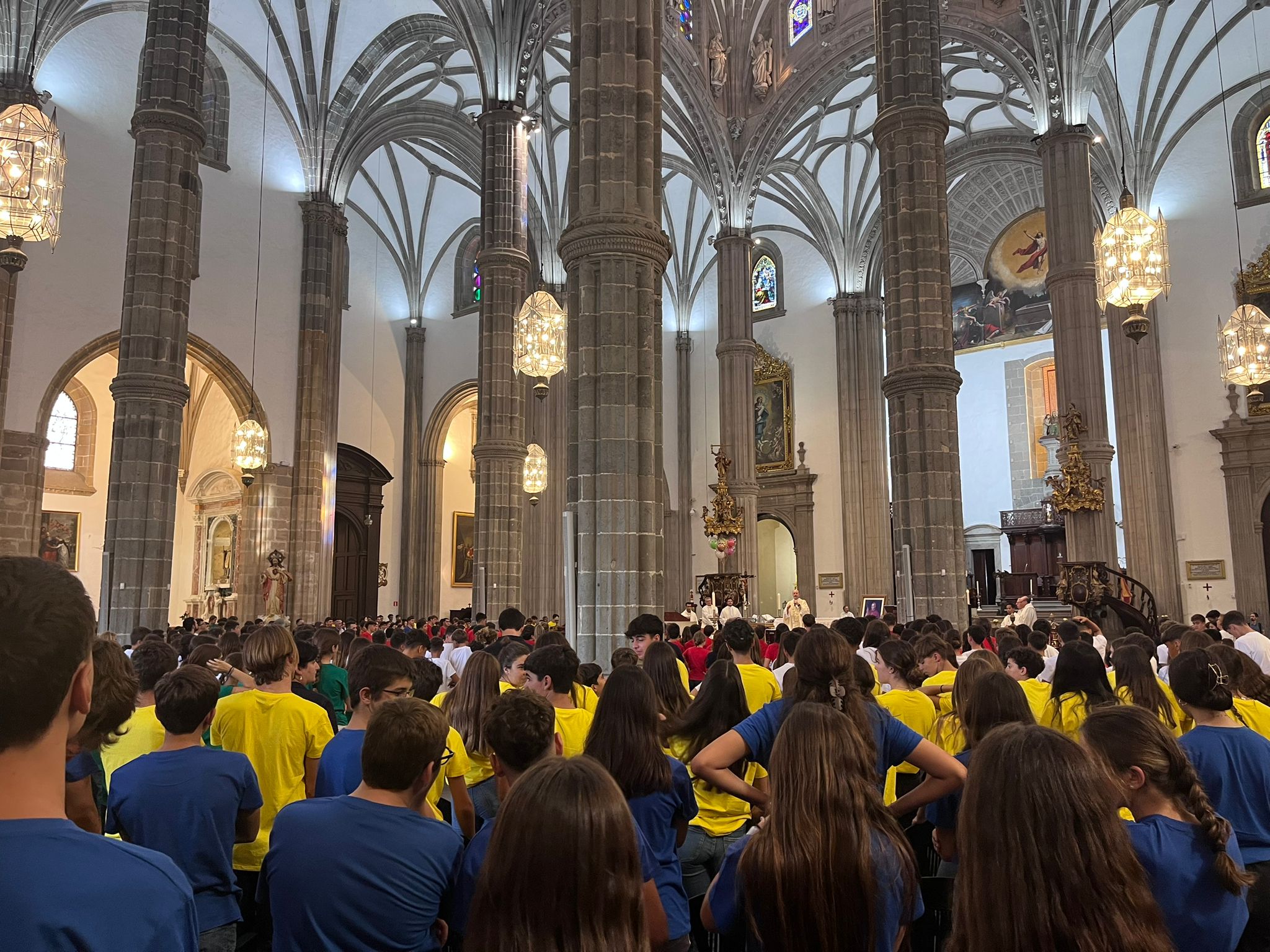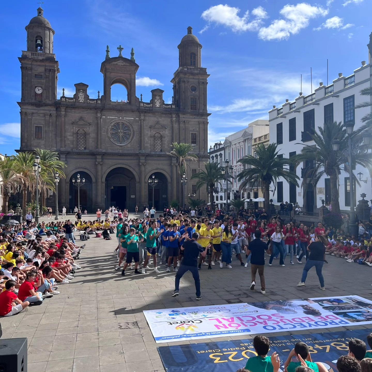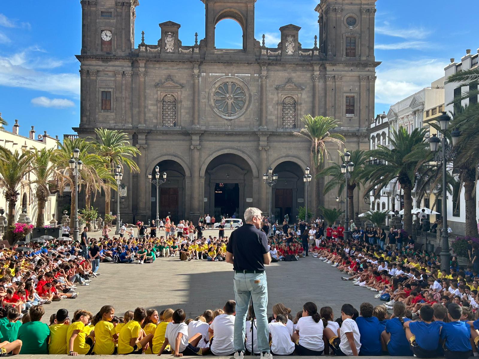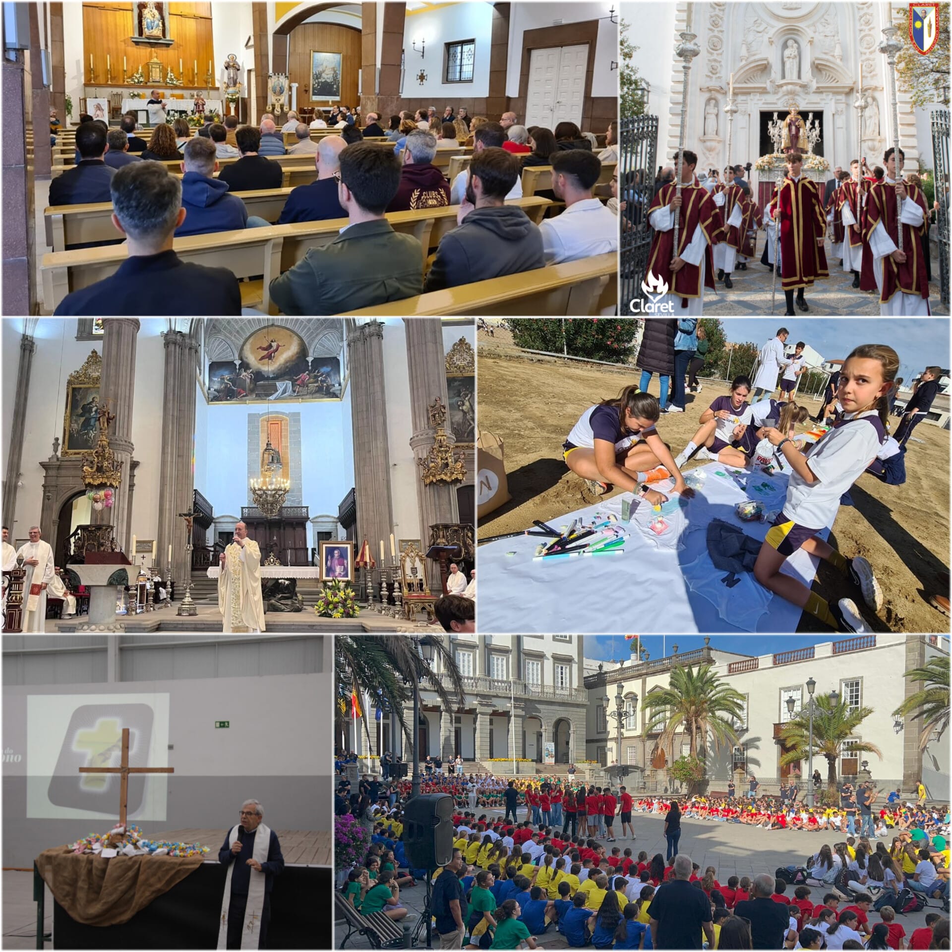 Foi um dia especial, pois o colégio também está a celebrar o 175º aniversário do Padre Claret na ilha. Cerca de 1.000 alunos do Colégio Claret de Las Palmas reuniram-se na Praça de Santa Ana e na Catedral para celebrar o 175º aniversário da passagem do seu santo padroeiro por Gran Canaria: por volta das 10h00, todos os alunos do ensino secundário, do 1º ESO ao 2º Bachillerato, partiram da secção de Rabadán passando por León y Castillo, Triana, Puente de Piedra e Obispo Codina até se encontrarem, pouco antes das 11h00, com os alunos do 5º ano da Escola Primária na Praça de Santa Ana. Tudo isto com a ajuda dos professores e da polícia local. Ali, ao ar livre, realizou-se um ato comemorativo para sublinhar a marca que o “Padrito” deixou na comunidade educativa, que culminou com uma mensagem do diretor, P. Juan José García cmf. De seguida, dirigiram-se à Sé Catedral onde teve lugar uma Eucaristia especial, presidida pelo P. Santiago Cerrato cmf.