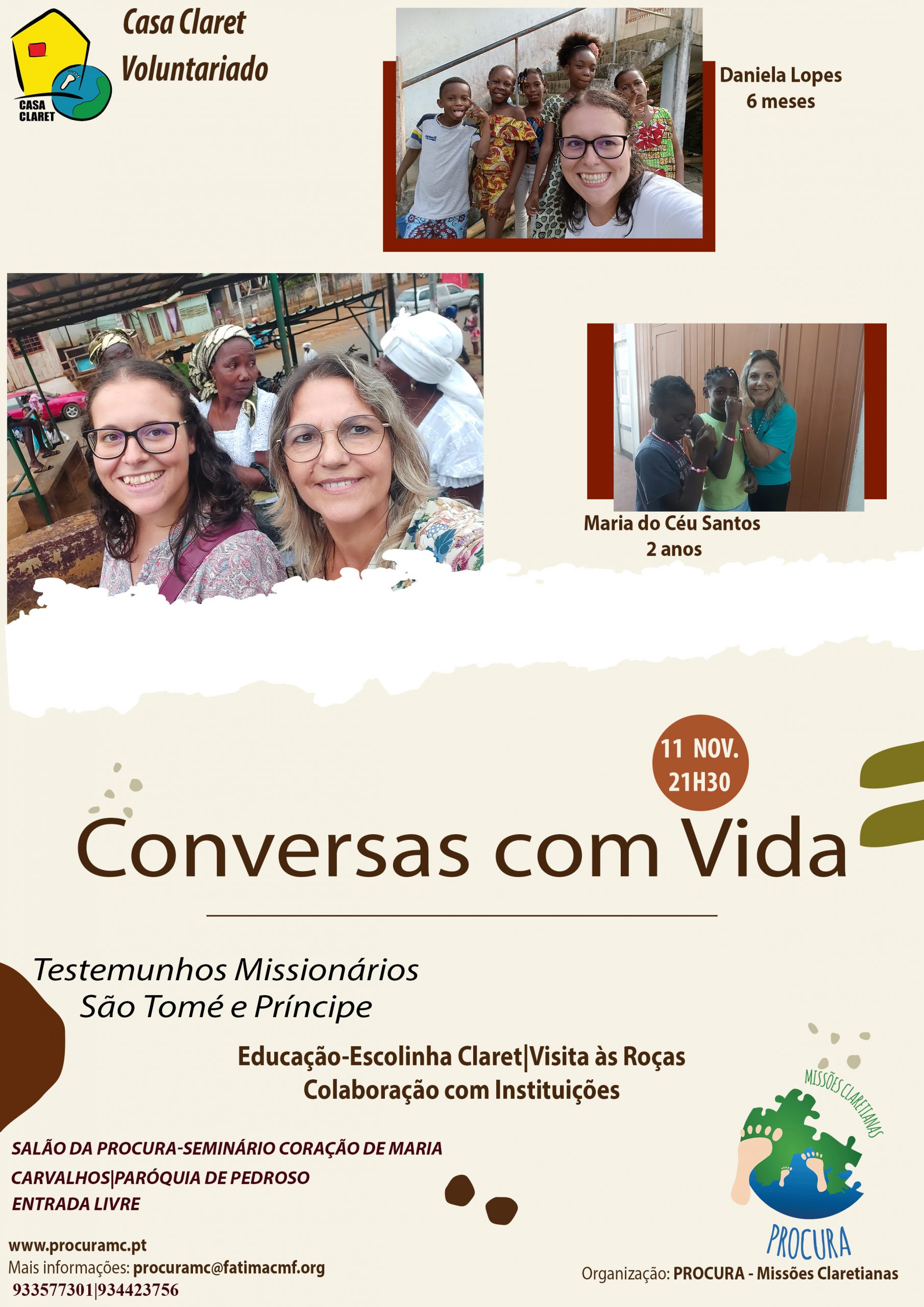 Além disso, a Delegação de Carvalhos celebra um novo encontro de ‘Conversas com Vida’ este sábado, 11 de novembro, às 21h30 no Seminário Coração de Maria em Carvalhos com o tema “Testemunhos Missionários de São Tomé e Príncipe”, um testemunho de Maria do Céu Santos e Daniela Lopes sobre a sua experiência na Casa Claret. Entrada livre.