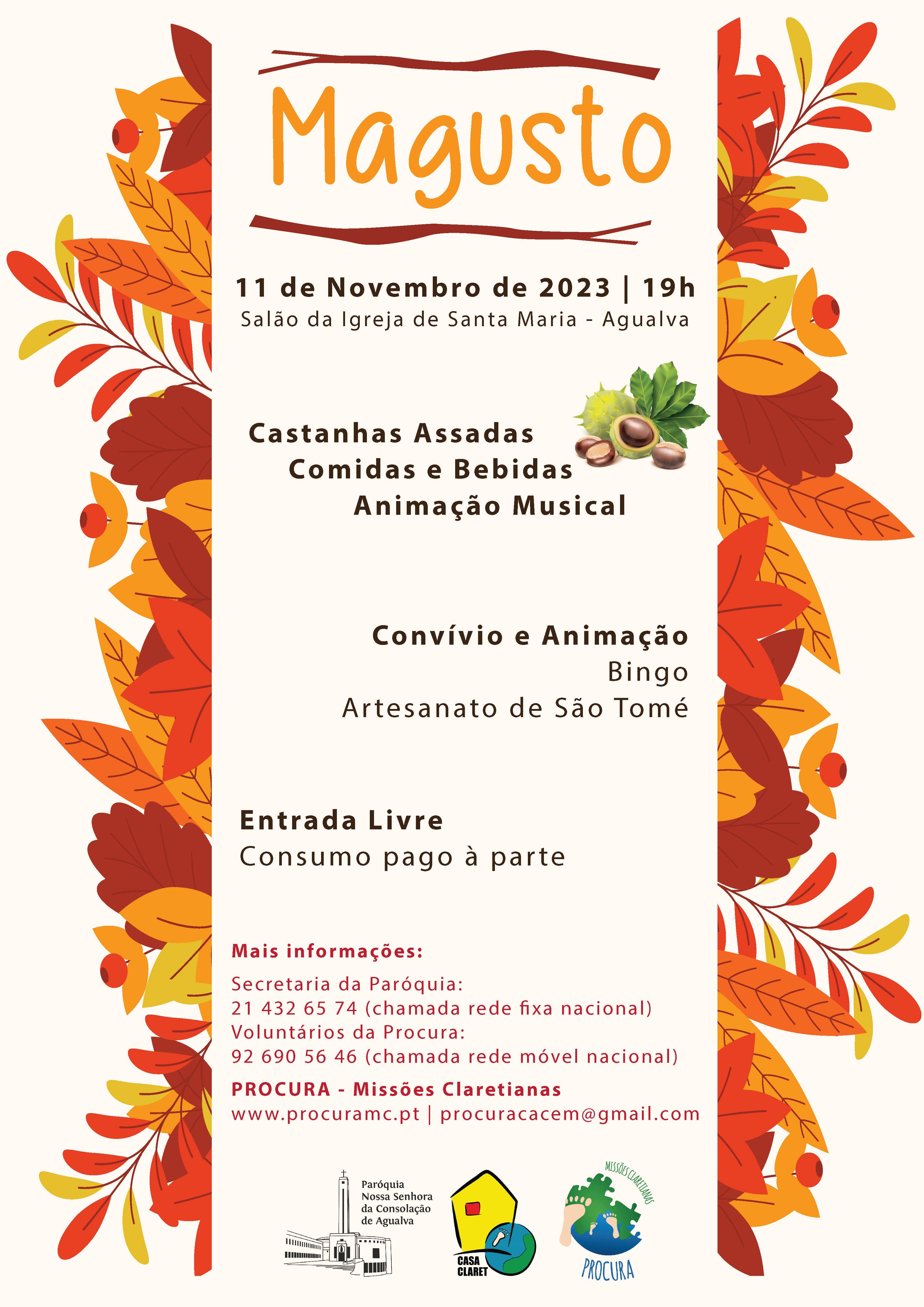 Tal como a Delegação de Carvalhos já o fez no passado dia 4 de novembro no Santuário do Coração de Maria de Carvalhos e cujos fundos reunidos serão destinados a favor dos projetos e iniciativas missionárias da PROCURA em Portugal e em São Tomé e Príncipe, a Delegação de Agualva-Cacém vai celebrar um ‘Magusto solidário’ no dia 11 de novembro, pelas 19h00, no salão de celebrações da Igreja de Santa Maria de Agualva, com animação musical, castanhas assadas, comida e bebida e um bingo solidário. Além disso, os fundos obtidos serão doados aos projectos e iniciativas missionárias da PROCURA em Portugal e em São Tomé e Príncipe. A entrada é livre.