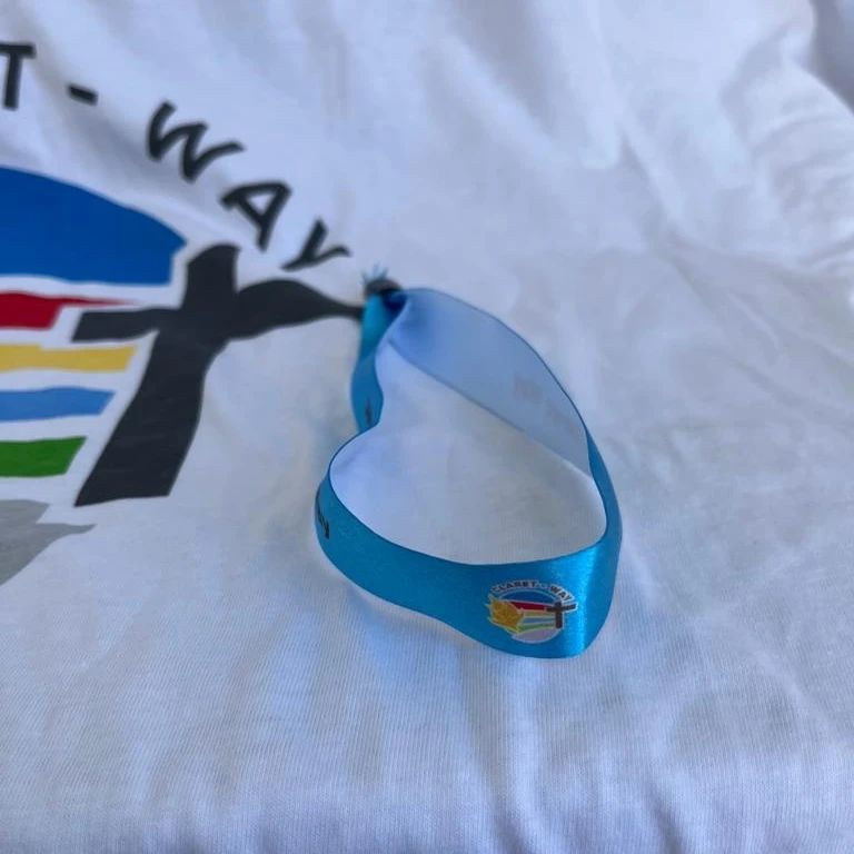 O kit é composto por uma t-shirt, mochila, boné, terço, pulseira, crachá, caneta e garrafa de água.