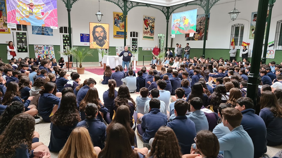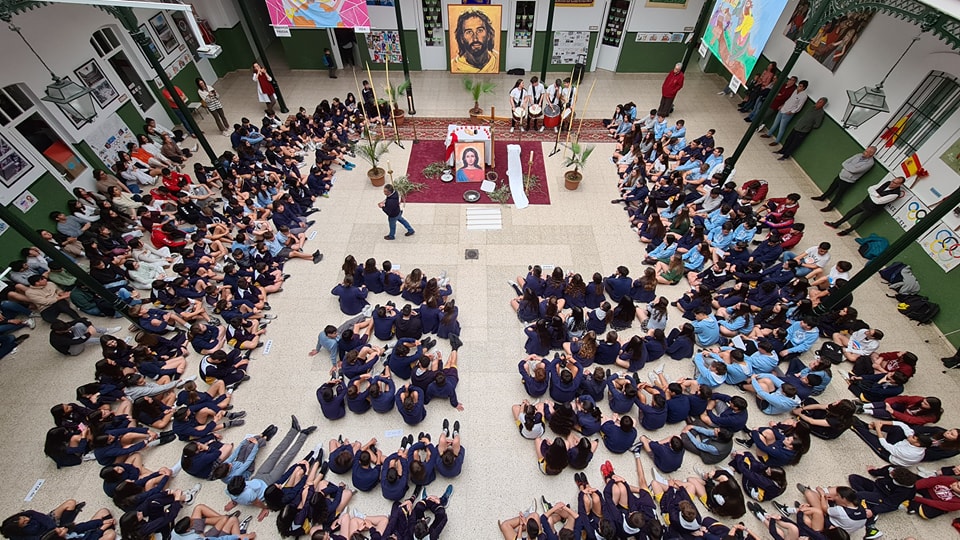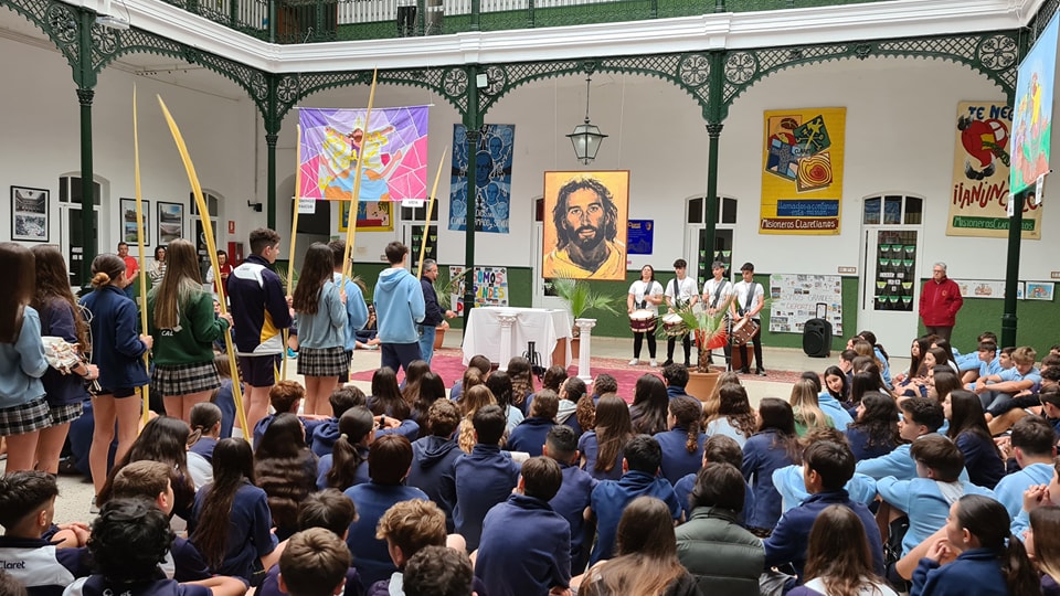Escola Claret em Don Benito. No dia 31 de Março, sexta-feira de Dores, todos os níveis de ESO e Bachillerato começaram o dia com uma oração comunitária no Patio de Cristales. Foi um momento especial com uma revisão de cada um dos momentos importantes da Semana Santa de uma forma muito pedagógica, com grande participação dos estudantes.